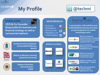 Este documento presenta la experiencia de Emilio Avilés como emprendedor de aplicaciones móviles. Comenzó en 2010 con la constitución de su empresa Slash Mobility y ha crecido de ofrecer servicios de consultoría y formación a desarrollar sus propios productos. Ha recibido varios premios y reconocimientos como ganador del Mini Campus de Emprendedores SeedRocket en 2010. Actualmente ofrece servicios de consultoría estratégica, desarrollo de aplicaciones, formación y tiene su propio producto llamado SlashLabs.