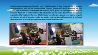 El estudiante completó sus prácticas preprofesionales en la Escuela San Francisco de Asís. En la primera semana fue asignado a un salón de tercer grado con 15 estudiantes y aprendió de la maestra. En la segunda semana fue asignado a otro salón de tercer grado y aprendió estrategias para niños de ese nivel. En la tercera semana fue asignado a un salón de cuarto grado donde la maestra lo motivó aún más para la docencia con sus consejos. El estudiante agradeció a la escuela y maest