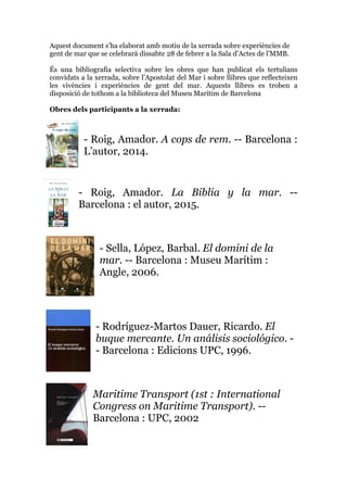 Este documento proporciona una bibliografía selectiva sobre obras relacionadas con experiencias de vida en el mar, incluyendo libros escritos por los oradores invitados a un evento en el Museo Marítimo de Barcelona sobre este tema, así como libros sobre el Apostolado del Mar y relatos personales de marineros. La biblioteca del museo alberga estas obras para que el público pueda consultarlas.