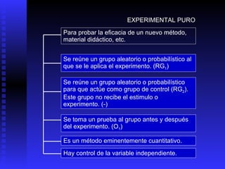 El documento describe tres tipos de diseños experimentales: puro, pre-experimental y cuasi-experimental. El diseño experimental puro asigna aleatoriamente sujetos a un grupo experimental y de control para probar la eficacia de un nuevo método o material. El diseño pre-experimental no es aleatorio ni tiene grupo de control. El diseño cuasi-experimental asigna grupos de forma no aleatoria pero incluye un grupo de control.