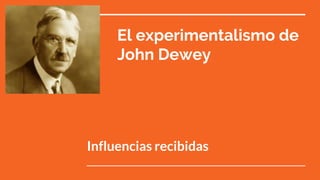 El documento resume las principales influencias y aspectos de la filosofía educativa de John Dewey. Dewey se vio influenciado por el idealismo hegeliano, el kantianismo, el darwinismo y el conductismo. Su filosofía se basa en que la inteligencia es un instrumento de adaptación y que la sociedad está en continuo cambio. Considera que el conocimiento se adquiere a través de la experiencia y la resolución de problemas. Su enfoque ha tenido un gran impacto al promover una educación basada en la vida real y democrática.