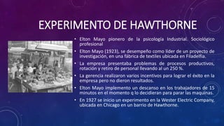 El experimento de Hawthorne estudió cómo las condiciones de trabajo afectaban la productividad de los empleados. Se realizaron varias fases donde se modificaron factores como la iluminación, los descansos y el horario laboral. Los resultados mostraron que la productividad aumentaba independientemente de los cambios, debido principalmente a que los empleados se sentían valorados y motivados por formar parte del estudio. Esto llevó a concluir que los factores humanos y sociales son clave para la eficiencia en el trabajo.