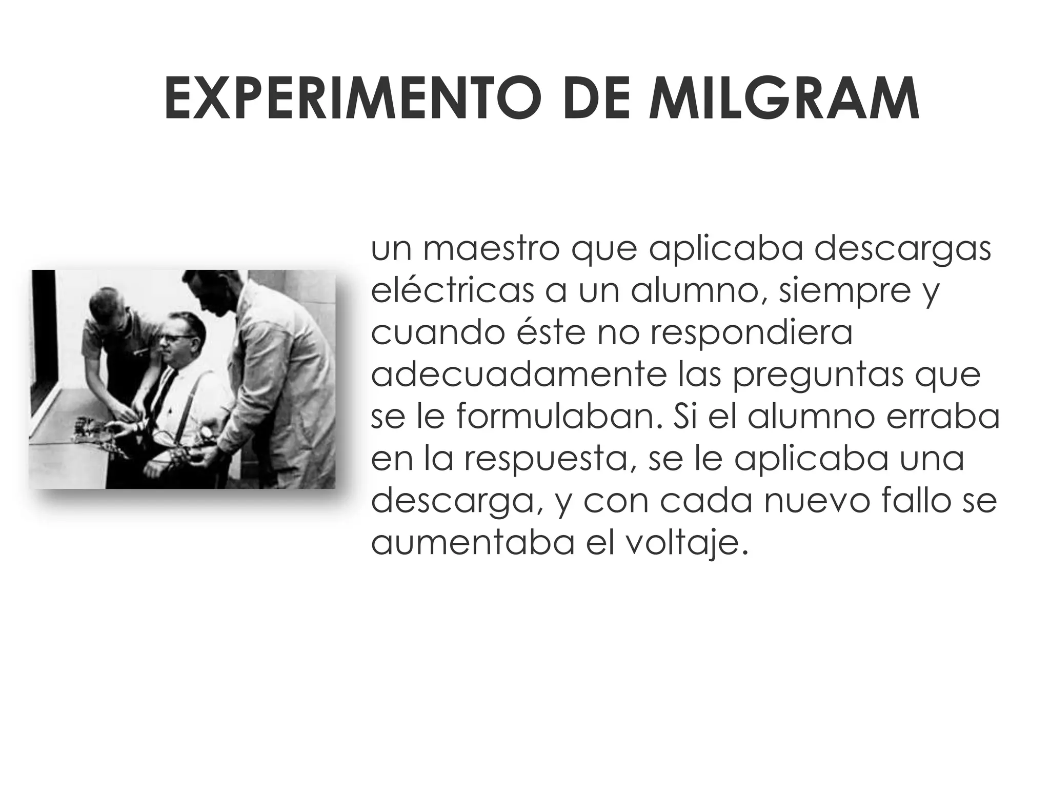1) El experimento de Milgram mostró que las personas pueden ser inducidas a dar descargas eléctricas potencialmente peligrosas a otro por obediencia a la autoridad.