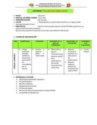 Este documento presenta un proyecto educativo dirigido a niños de 4 o 5 años sobre un experimento científico llamado "Vela que hace subir el agua". El objetivo es que los niños puedan expresar sus ideas y obtener información a través de sus sentidos. El experimento involucra materiales como queques, velas, fósforos, platos y una botella con líquido rojo. A través de canciones y preguntas, los niños realizarán el experimento e intercambiarán hipótesis. Al final, se les explicará que