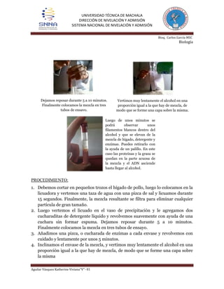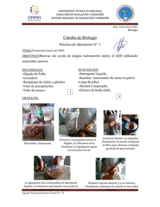 Este documento presenta una práctica de laboratorio sobre la extracción casera de ADN. El objetivo es observar el ADN sin ayuda de instrumentos ópticos usando materiales domésticos. Se detalla el procedimiento que incluye licuar hígado de pollo, agregar detergente y enzimas, y luego vertir alcohol para separar el ADN de las otras sustancias. Al cabo de unos minutos se pueden ver filamentos blancos de ADN flotando en el alcohol.