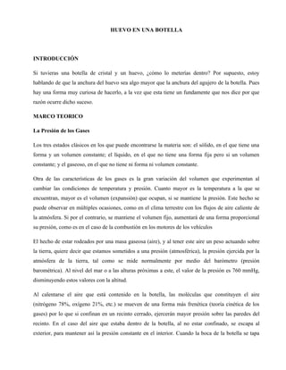 Este documento describe un experimento para introducir un huevo en una botella debido a las diferencias de presión. Explica que al calentar el aire dentro de la botella con un algodón empapado en alcohol, la presión disminuye y el huevo es empujado hacia adentro por la mayor presión externa del aire. Luego, al calentar la botella, la presión interna aumenta y el huevo puede sacarse.