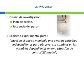 El documento describe el diseño experimental puro, el cual involucra la manipulación intencional de una o más variables independientes para observar sus efectos en las variables dependientes en una situación controlada. Explica cuatro tipos básicos de experimentos puros y sus características, así como los requisitos para un experimento puro válido que incluyen la manipulación de variables, medición de efectos y control interno. Finalmente, discute brevemente las ventajas, desventajes y alcances de este tipo de diseño experimental.