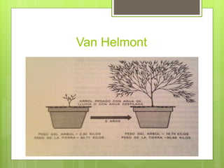 Jean Baptiste van Helmont realizó un experimento en el que hizo crecer un sauce en una maceta con solo agua durante 5 años. El árbol ganó 74 kg de peso mientras que la tierra en la maceta solo perdió 57 g. Van Helmont concluyó incorrectamente que toda la sustancia de la planta provenía del agua y no del suelo, siendo uno de los primeros experimentos biológicos diseñados.