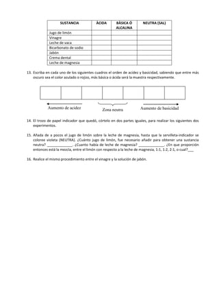 1) La práctica describe los materiales y procedimientos para realizar cuatro experimentos sobre ácidos, bases, sales, pilas electroquímicas, reacciones de oxidación-reducción y densidad.