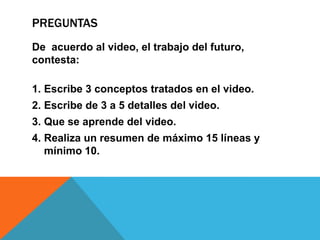 El documento discute cómo el trabajo está evolucionando y cambiando. Señala que para sobrevivir en el futuro, tanto las empresas como los trabajadores necesitarán adaptarse y evolucionar con los cambios. Explica que ahora gran parte del trabajo se realiza de forma remota a través de Internet y que las personas pueden elegir trabajos en cualquier parte del mundo. Además, destaca nuevas herramientas como las redes sociales y dispositivos móviles que son cada vez más importantes tanto para el ocio como para el trabajo.
