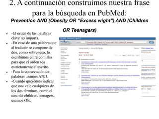 El documento proporciona instrucciones en 4 pasos para realizar una búsqueda en la base de datos PubMed sobre la prevención de la obesidad y el sobrepeso en niños y adolescentes. Primero, identifica las palabras clave en inglés relacionadas con el tema. Segundo, construye la frase de búsqueda utilizando los operadores lógicos AND y OR. Tercero, agrega filtros para idioma, tipo de artículo y fecha. Cuarto, selecciona los filtros específicos solicitados y realiza la búsqu