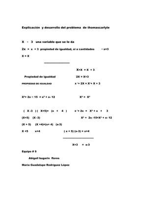 El documento presenta la resolución de una ecuación algebraica en 3 pasos: 1) Se define una variable X = 3. 2) Se aplica la propiedad de igualdad 2x = x + 3. 3) Se resuelve la ecuación resultante (X + 5) (X + 4) = (x + 4) (x - 3) para encontrar que X + 3 = x - 3.