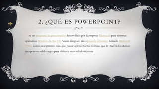 Este documento describe las características y funciones básicas de PowerPoint. Explica qué es PowerPoint, sus partes principales como la barra de título, barra de herramientas y área de diapositivas. También describe cómo agregar notas, insertar capturas de pantalla, aplicar temas y transiciones, y reproducir presentaciones de manera automática. Finalmente, explica los cuatro tipos principales de animación en PowerPoint.