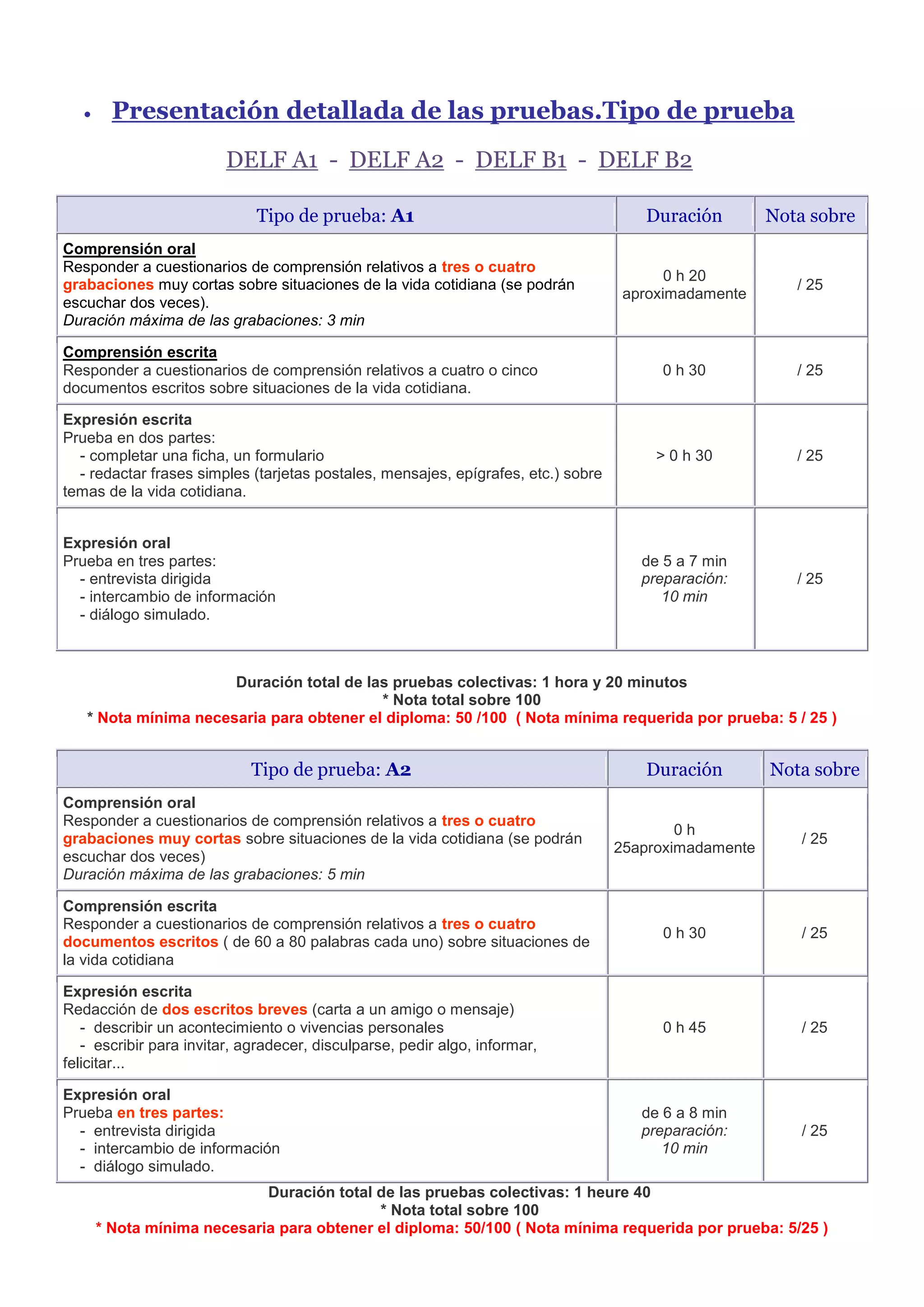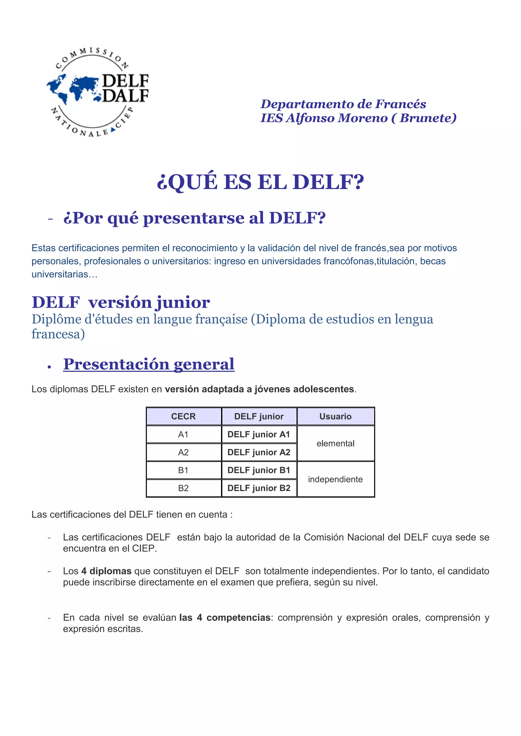 Este documento describe el Diploma de Estudios en Lengua Francesa (DELF), una certificación que valida el nivel de francés. Existen cuatro niveles (A1, A2, B1, B2) que evalúan las cuatro habilidades (comprensión y expresión oral y escrita). Cada nivel incluye pruebas específicas con una duración y nota determinadas. El documento también explica cómo inscribirse y los costos asociados con las pruebas del DELF.