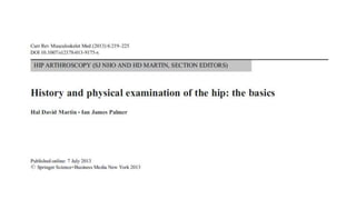 Este documento presenta 21 pasos para la evaluación completa de la articulación de la cadera. Describe pruebas para evaluar lesiones osteocondrales, capsulolabrales, musculotendinosas y neurovasculares de la cadera. Algunas pruebas comunes incluyen el test de Trendelemburg, test de FABER, test DIRI, test DEXRIT y test de Ely para evaluar la fuerza muscular, laxitud ligamentaria y congruencia de la articulación de la cadera.