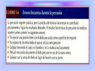 Este documento describe diferentes técnicas de percusión y auscultación utilizadas en medicina. La percusión involucra golpear metódicamente un área para producir sonidos y localizar problemas, mientras que la auscultación usa el oído para escuchar sonidos. Existen diferentes tipos de percusión como directa, indirecta, simple e instrumental. La percusión auscultatoria combina ambas técnicas para delimitar órganos. Se deben seguir reglas como posición relajada y ambiente silencioso para obtener datos precisos.