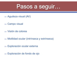 El documento resume los aspectos fundamentales de la exploración oftalmológica. Incluye la evaluación de la agudeza visual, campo visual, visión de colores, motilidad ocular, tonometría, y exploración del segmento anterior y fondo de ojo mediante oftalmoscopia. El objetivo es detectar cualquier anomalía que pueda estar afectando la visión.