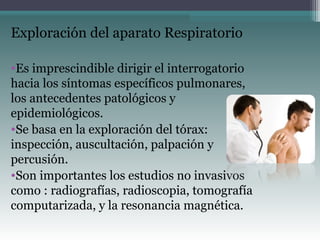 El documento describe los procedimientos para la exploración pulmonar, incluyendo la inspección, palpación, percusión y auscultación del tórax. Detalla los pasos para cada maniobra, los hallazgos normales y anormales, y provee definiciones de términos médicos relevantes como murmullo pulmonar y matidez hídrica. El objetivo es proporcionar una guía para realizar un examen pulmonar completo y detectar cualquier anomalía.