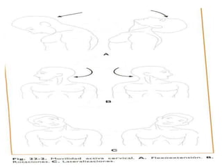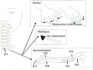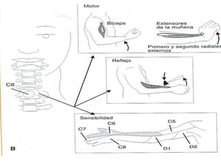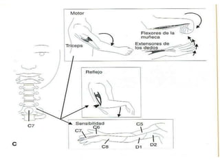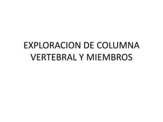 Estas tres oraciones resumen las pruebas y maniobras descritas en el documento para explorar la columna vertebral y miembros: La maniobra de Spurling explora la compresión de la columna cervical, la prueba de Adson examina la compresión del plexo braquial, y la maniobra de Lasegue prueba la compresión del nervio ciático.