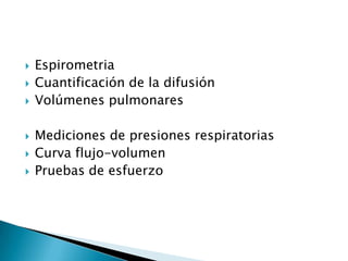 1) La espirometría y otras pruebas funcionales respiratorias como la capacidad de difusión pulmonar y los volúmenes pulmonares se utilizan para evaluar enfermedades pulmonares como EPOC, asma y enfermedades restrictivas.