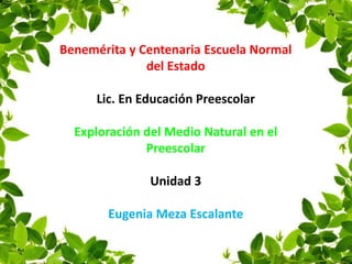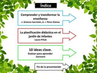 Este documento presenta una unidad sobre la exploración del medio natural en el preescolar. Incluye capítulos sobre la didáctica y el aprendizaje escolar, con énfasis en partir de la cultura experiencial del alumno. También describe diferentes tipos de juego en el jardín de infantes como el juego-trabajo y el juego dramático. Por último, presenta ideas clave sobre la evaluación para promover el aprendizaje, como que la evaluación debe regular la enseñanza y que es importante que los estudiantes se autoevalu