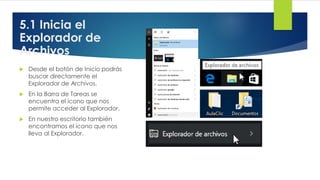 Este documento describe las funciones y características del Explorador de Archivos en Windows. Explica cómo iniciar el Explorador de Archivos, las diferentes áreas de su ventana principal, cómo seleccionar y organizar archivos y carpetas, y cómo realizar acciones comunes como copiar, mover y eliminar elementos. También cubre temas como personalizar la apariencia y opciones del Explorador, y utilizarlo para acceder a redes inalámbricas.