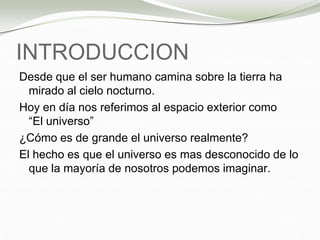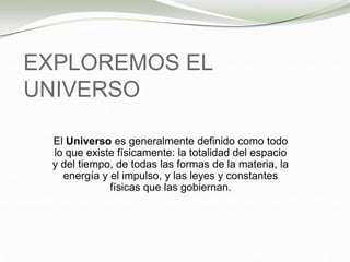 El documento explora el origen y evolución del universo. Comienza describiendo el universo como todo lo que existe físicamente y continúa explicando teorías antiguas como la geocéntrica y heliocéntrica. Luego describe avances científicos como las leyes de Kepler, la teoría del Big Bang y la formación de galaxias, estrellas y agujeros negros. Finalmente, resume la importancia de telescopios como el Hubble para el estudio y comprensión del universo.