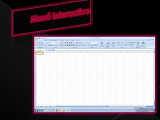 Este documento proporciona una introducción a las principales características de Excel, incluyendo el menú interactivo, las barras de título, inicio y menú, el botón de ayuda, la barra de herramientas, las celdas activas, el asistente de funciones, las filas y columnas, las barras de desplazamiento vertical y horizontal, las hojas de trabajo, la vista de hoja y el zoom. Explica los diferentes componentes de la interfaz de usuario de Excel.