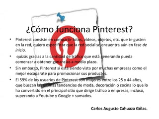 Pinterest se está convirtiendo en una popular red social donde los usuarios comparten fotos, videos y otros objetos que les interesan. Aunque todavía está en fase inicial, Pinterest está generando mucho tráfico y es vista por muchas empresas como una buena forma de promocionar sus productos. La mayoría de usuarios de Pinterest son mujeres entre 25 y 44 años que buscan tendencias de moda, decoración y cocina.