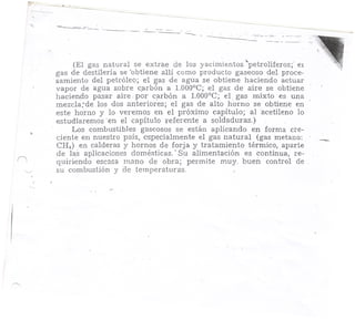 El documento describe los diferentes tipos de combustibles sólidos, líquidos y gaseosos, incluyendo su origen, composición química y poder calorífico. Explica que el carbón vegetal se produce por la carbonización de residuos vegetales y tiene un poder calorífico más alto que la madera. También describe los diferentes tipos de carbón mineral como la hulla y la antracita, formados por la transformación de vegetales enterrados bajo sedimentos. Por último, resume que el petróleo es una mezcla de hidrocarburos de origen fósil proced