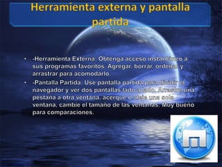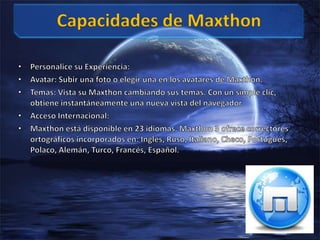 El documento habla sobre las características del navegador web Maxthon que facilitan la navegación. Maxthon permite sincronizar favoritos, notas y preferencias entre dispositivos a través de Maxthon Passport. También permite crear atajos de sitios web frecuentes y organizar el historial de navegación por día en un calendario para ver fácilmente los sitios visitados. Otra característica es realizar búsquedas múltiples en varios motores de búsqueda de manera simultánea.