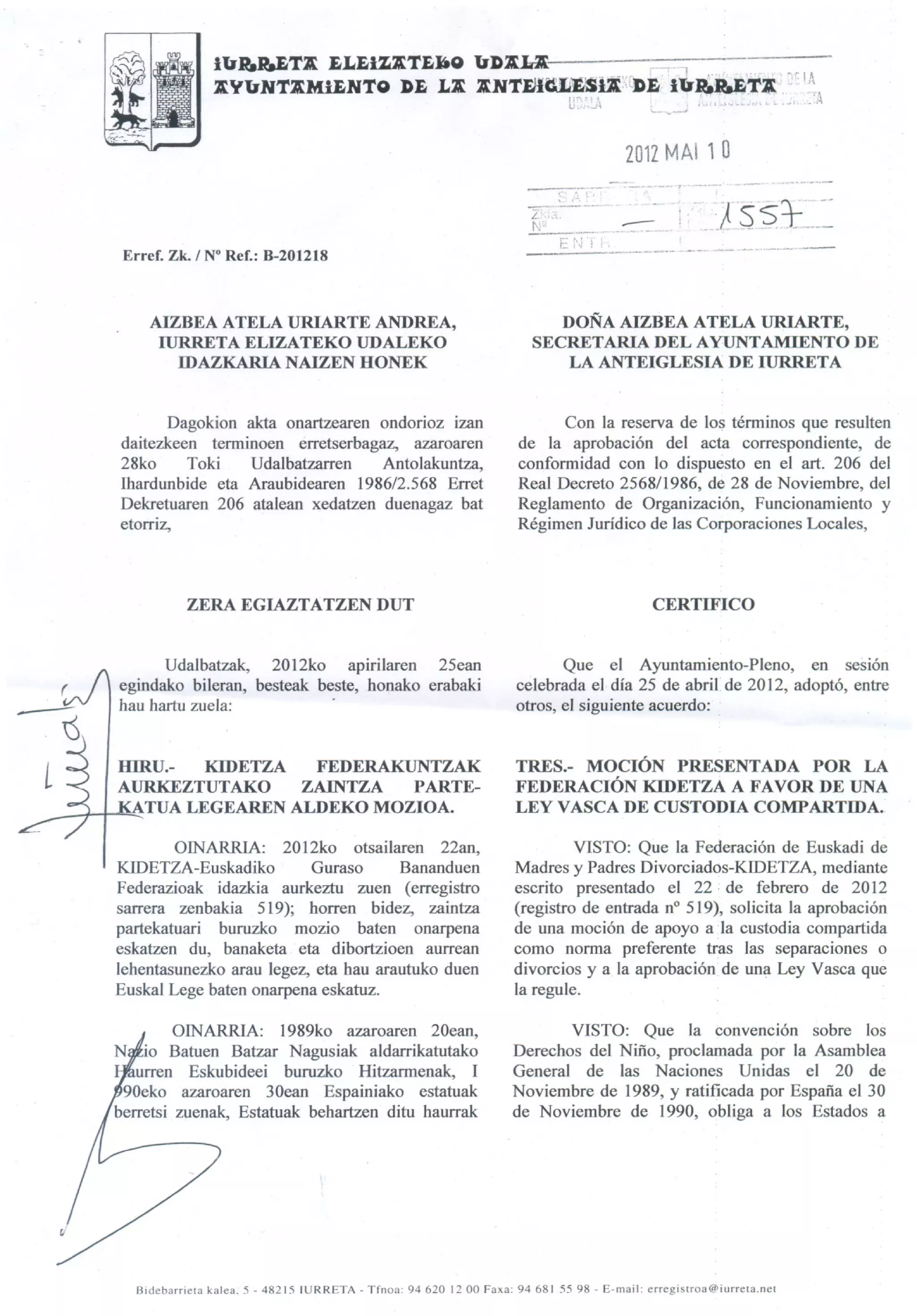 1) La Federación KIDETZA solicitó la aprobación de una moción a favor de la custodia compartida como norma preferente tras separaciones o divorcios, y una Ley Vasca que la regule.