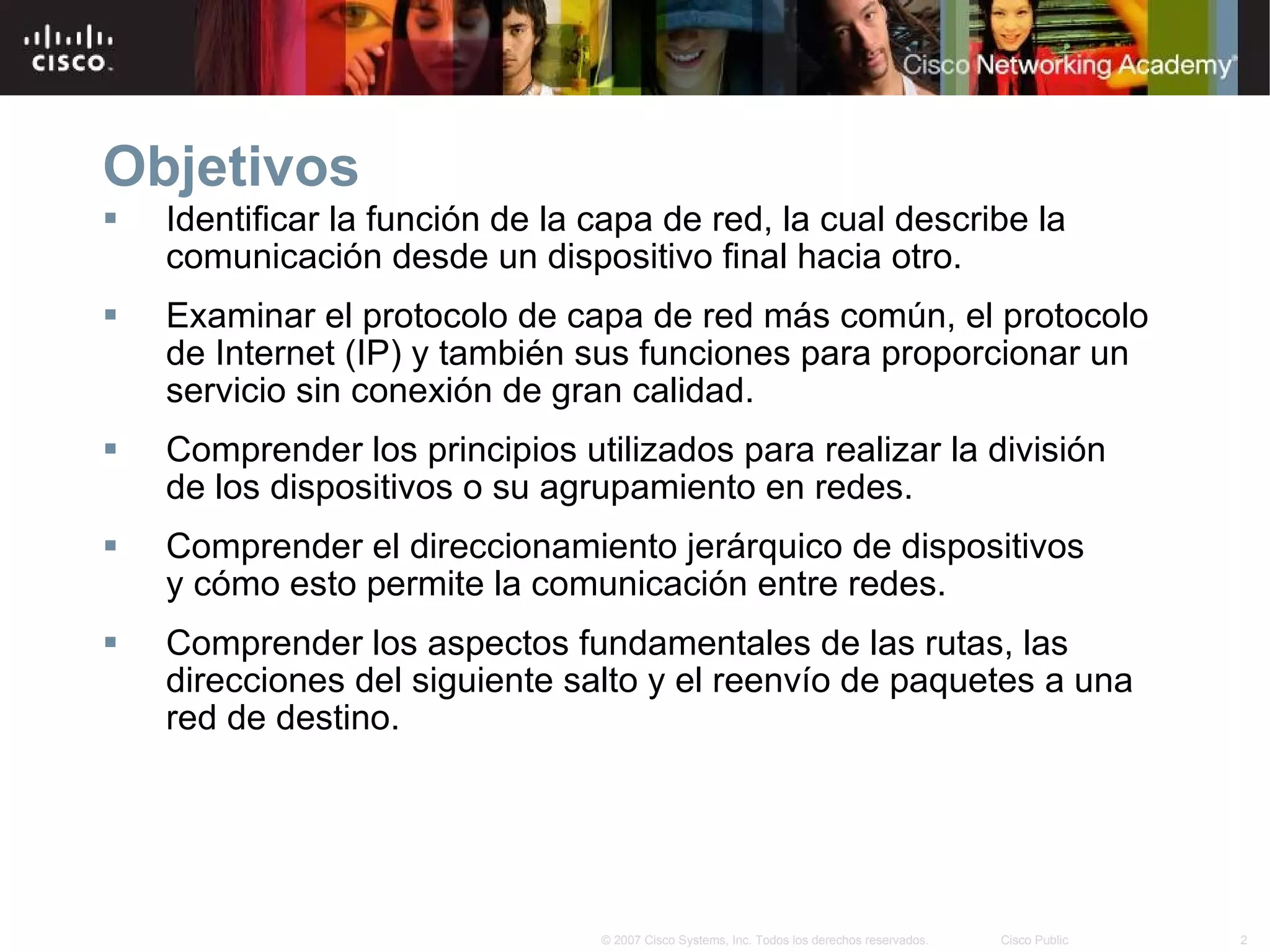 La capa de red describe la comunicación entre dispositivos finales a través de redes. El protocolo más común es IP, que proporciona un servicio sin conexión y no depende de los medios. IP divide las redes en subredes mediante direccionamiento jerárquico, permitiendo la comunicación entre dispositivos a través de rutas que incluyen gateways y tablas de enrutamiento.