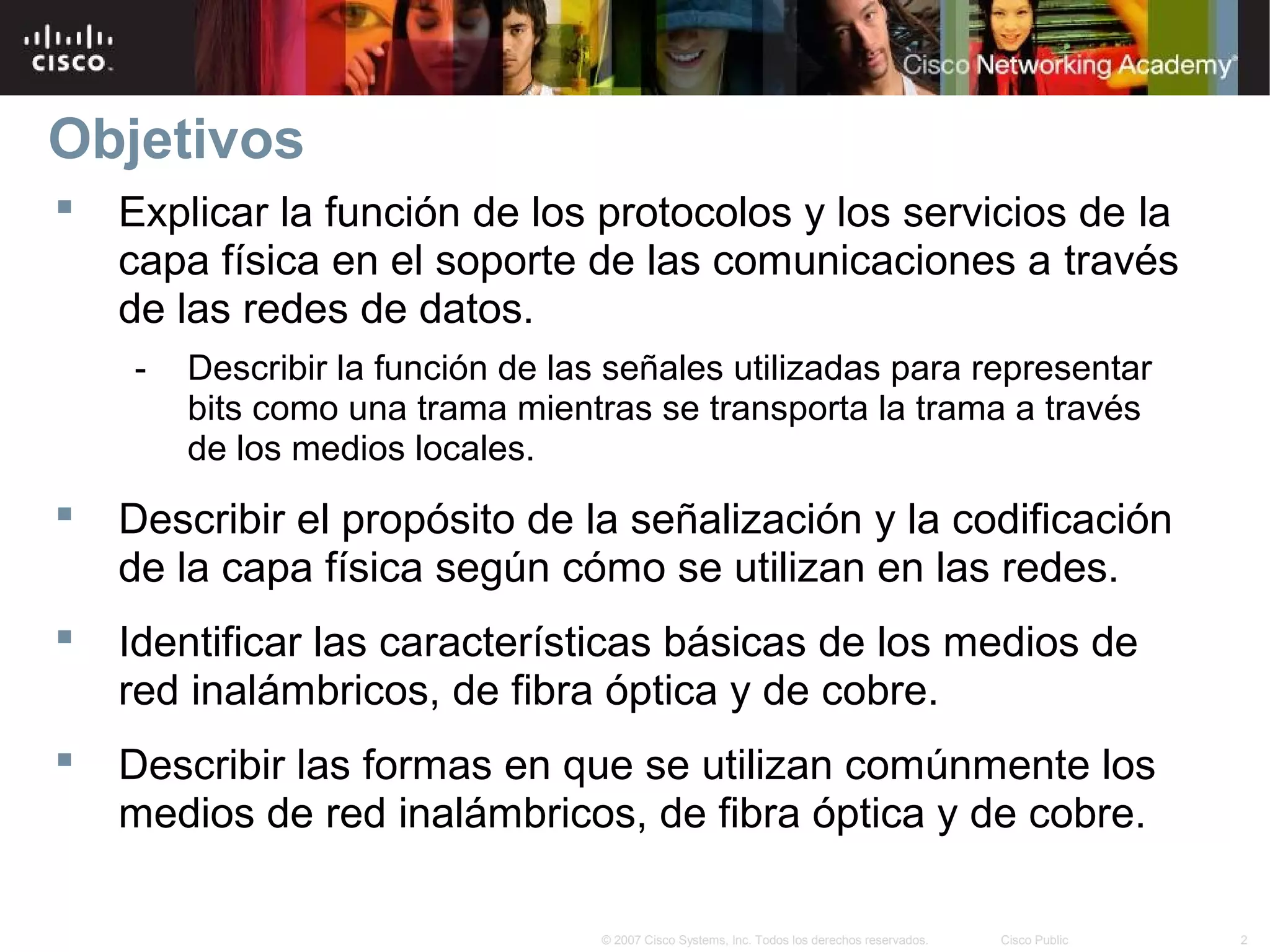 Este documento describe la capa física del modelo OSI, incluyendo sus objetivos, servicios y protocolos. Explica cómo la capa física transforma las comunicaciones en bits y cómo representa las señales en diferentes tipos de medios como cable de cobre, fibra óptica e inalámbricos. Además, compara los estándares de capa física con los de capas superiores y describe los principios fundamentales de codificación de datos y señalización.