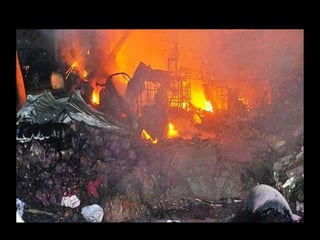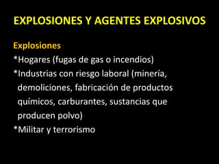 El documento describe los tipos de explosiones, agentes explosivos y efectos de las explosiones. Describe cinco efectos de las explosiones (primario, secundario, terciario, cuaternario y quinario) y los tipos de lesiones asociados a cada uno. También explica los patrones de lesiones comunes en explosiones y atentados terroristas, incluyendo una mayor incidencia de lesiones en la cabeza y una alta tasa de mortalidad por lesiones pulmonares y abdominales/torácicas.