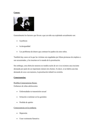 La explotación sexual es una actividad ilegal en la que una persona es forzada a realizar actos sexuales sin su consentimiento para beneficio económico de un tercero. Afecta principalmente a mujeres, niñas y niños. Más de 2 millones de personas son explotadas sexualmente en el mundo cada año. Las víctimas sufren consecuencias físicas, psicológicas y problemas con su identidad, autoestima, sexualidad y habilidades sociales.