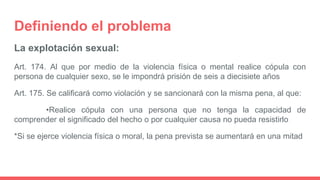 La explotación sexual incluye la violencia y abuso sexual con fines comerciales. Históricamente se remonta a la conquista española y trata de personas en los siglos posteriores. Factores como la pobreza, redes de tráfico infantil y crisis humanitarias contribuyen a esta práctica. Existen posturas a favor y en contra de criminalizar a los clientes o considerar la prostitución un trabajo. Soluciones éticas deben respetar la autonomía y considerar las consecuencias de los actos para el mayor bienestar.