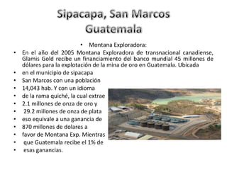 El documento resume información sobre varias minas en Guatemala. Montana Exploradora recibió $45 millones del Banco Mundial para una mina de oro en San Marcos que generó $870 millones, mientras Guatemala solo recibió el 1%. El proyecto Fénix controla la explotación de níquel en El Estor y genera el 20.3% de ganancias para Guatemala. Gold Corp explota oro y plata en Jutiapa hablándose idiomas locales. Los pobladores de Cunén rechazaron el 98% la minería propuesta. La min