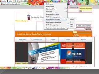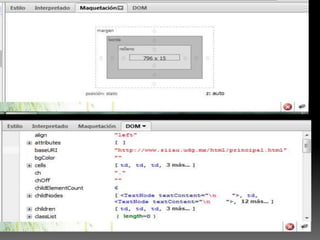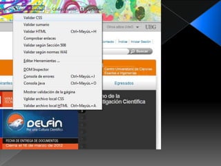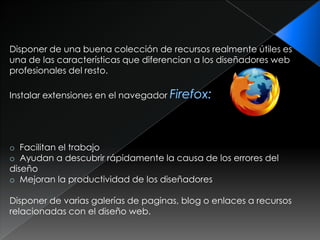 El documento describe varias extensiones útiles para diseñadores web como Firebug, Web Developer e HTML Validator. Explica que estas extensiones facilitan el trabajo de los diseñadores al ayudar a identificar errores y mejorar la productividad. También recomienda varios recursos como galerías, blogs y enlaces relacionados con el diseño web.