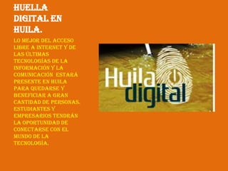 El documento habla sobre el proyecto Huila Digital en Colombia. El proyecto busca brindar acceso libre a Internet y las últimas tecnologías de la información a estudiantes y empresarios en el departamento de Huila. El proyecto Huila Digital es desarrollado por la Corporación Maloka y la Gobernación del Huila para beneficiar a muchas personas en la región a través del uso de las tecnologías de la información y la comunicación.
