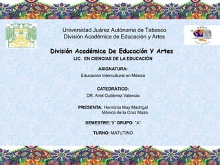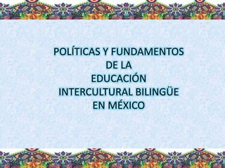 Este documento presenta un resumen de las políticas y fundamentos de la educación intercultural bilingüe en México. Explica el marco jurídico-político que incluye la Constitución mexicana y la nueva Ley General de Derechos Lingüísticos de los Pueblos Indígenas. También describe los principios filosóficos, conceptuales y pedagógicos de la educación intercultural, así como sus propósitos y diferentes escenarios educativos.