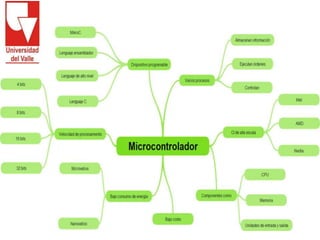 Este documento contiene información sobre electrónica análoga y microcontroladores. En la sección de electrónica análoga, explica que estudia la variación de valores eléctricos en el tiempo y se divide en electrónica análoga dinámica y hidráulica. La sección de microcontroladores indica que es un dispositivo que maneja múltiples procesos mediante programación y contiene una CPU, memoria y unidades de entrada y salida, y que han ganado popularidad debido a su bajo costo y consumo de energía.