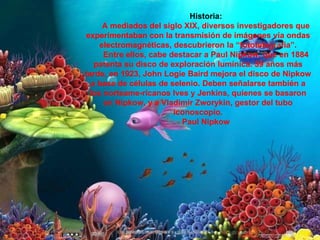 El documento describe los orígenes de la televisión a mediados del siglo XIX cuando investigadores como Paul Nipkow descubrieron la fototelegrafía y desarrollaron el disco de exploración lumínica para transmitir imágenes. Más tarde, en 1923, John Logie Baird mejoró este disco utilizando células de selenio. El documento también menciona brevemente a otros pioneros tempranos de la televisión como Ives, Jenkins y Vladimir Zworykin.