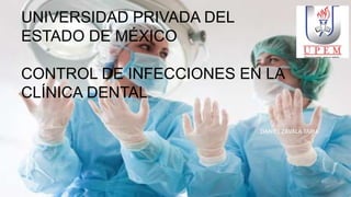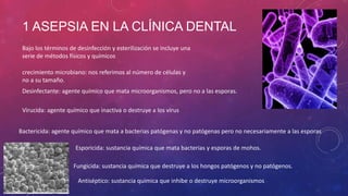 Este documento describe los procedimientos de control de infecciones en una clínica dental. Explica los métodos de desinfección y esterilización, incluyendo los desinfectantes químicos utilizados. También identifica las superficies que deben desinfectarse y los protocolos para la desinfección del personal, los pacientes, los instrumentos y el área clínica antes, durante y después de cada paciente y al final del día.