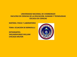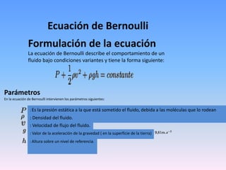 La ecuación de Bernoulli describe el comportamiento de un fluido bajo condiciones variantes. Relaciona la presión, densidad, velocidad y altura de un fluido en movimiento. Se aplica en chimeneas, tuberías, carburadores, alas de aviones y otros dispositivos como Venturi. Fue formulada originalmente por Daniel Bernoulli y luego generalizada por Euler basada en la conservación de la energía.