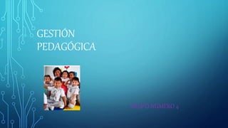 El grupo número 4 presentó sobre la gestión pedagógica. Jenny Lema entregó el material didáctico, y Guadalupe Barcia hizo una dinámica para introducir el tema. Luego, explicaron las acciones y decisiones de la institución educativa para lograr las competencias, y Cristian Calderón mencionó autores y definiciones de gestión pedagógica. Marco Masabanda habló del papel del docente en el proceso de enseñanza, y Ricardo Marco explicó la importancia del trabajo en equipo. Finalmente, Marco Toapanta