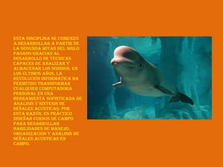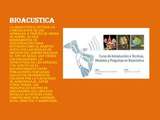 La bioacústica estudia la comunicación animal a través del sonido, analizando cómo el hábitat y las reglas de difusión del sonido moldean las señales de los organismos. Esta disciplina se desarrolló a partir de la segunda mitad del siglo XX con el avance de técnicas de análisis de sonido, y ahora la computación permite transformar cualquier computadora en una herramienta sofisticada para estudiar señales acústicas.