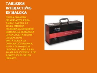 Edumedios, una empresa colombiana de software educativo y nuevas tecnologías, donará dos tableros interactivos portátiles a la Corporación Maloka en un evento que tendrá lugar el 17 de agosto a las 10 am. La donación beneficiará a ambas partes, ya que Maloka podrá usar la alta tecnología de los tableros para presentaciones pedagógicas, mientras que Edumedios fortalecerá su labor social y obtendrá publicidad positiva de estar asociado con Maloka.
