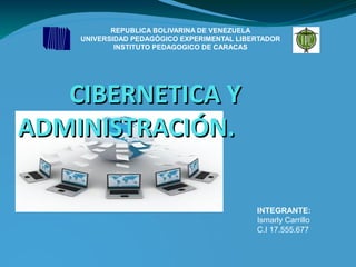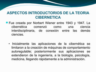 La teoría cibernética fue creada por Norbert Wiener entre 1943 y 1947. Se aplica a sistemas que reciben entradas, procesan información y producen salidas. La cibernética ha tenido consecuencias importantes en la administración como la automatización y la informática, lo que puede reducir puestos de trabajo pero también jornadas laborales.