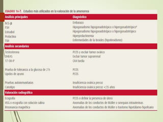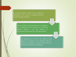 El documento describe diferentes tipos de amenorrea, incluyendo amenorrea primaria, secundaria y fisiológica. También describe varias causas de amenorrea como anomalías anatómicas del aparato genital como himen imperforado, síndrome de Rokitansky-Kuster-Hauser y síndrome de insensibilidad a los andrógenos. Además, explica trastornos endocrinos como hipogonadismo hipergonadotrópico e hipogonadotrópico que pueden causar amenorrea.